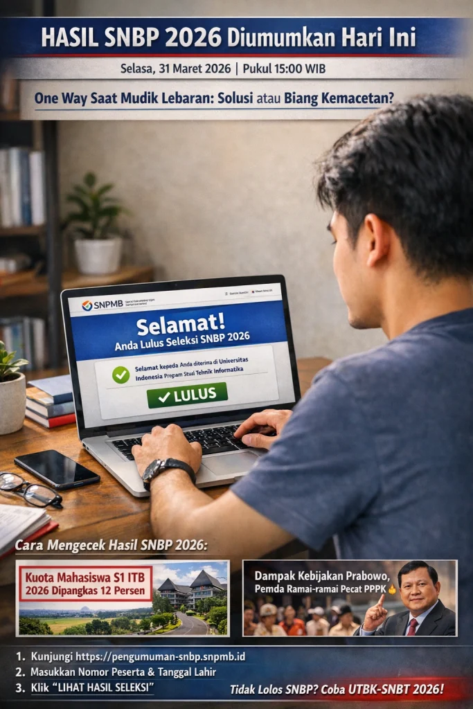 Hasil Seleksi Nasional Berdasarkan Prestasi (Bazokabet SNBP) 2026 akan diumumkan pada Selasa, 31 Maret 2026 pukul 15.00 WIB melalui laman resmi Seleksi Nasional Penerimaan Mahasiswa Baru. Ribuan siswa dari seluruh Indonesia kini menanti hasil seleksi yang menjadi salah satu jalur utama masuk perguruan tinggi negeri.